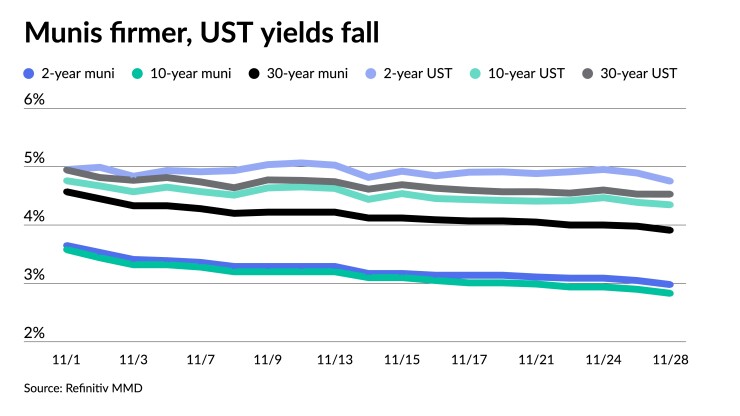 Municipal triple-A curves saw yields fall four to seven basis points, depending on the curve while USTs saw the biggest gains 10 years and in.