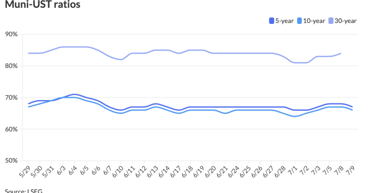 The two-year muni-to-Treasury ratio Tuesday was at 65%, the three-year at 66%, the five-year at 67%, the 10-year at 66% and the 30-year at 83%, according to Refinitiv Municipal Market Data’s 3 p.m. EST read. ICE Data Services had the two-year at 65%, the three-year at 66%, the five-year at 67%, the 10-year at 67% and the 30-year at 83% at 3:30 p.m.