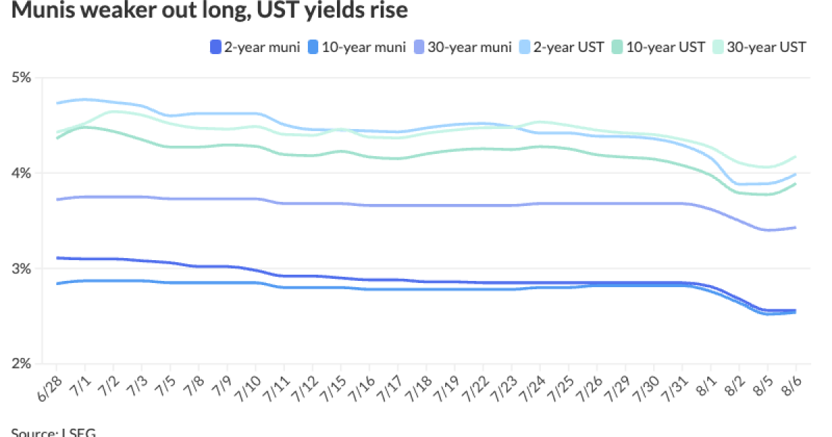 Despite a setback Tuesday, “with the recent economic numbers indicating that we should expect that the Fed will reduce rates in September due to the weak jobs data on Friday, we should continue to see munis push further into positive territory,” Wong said.