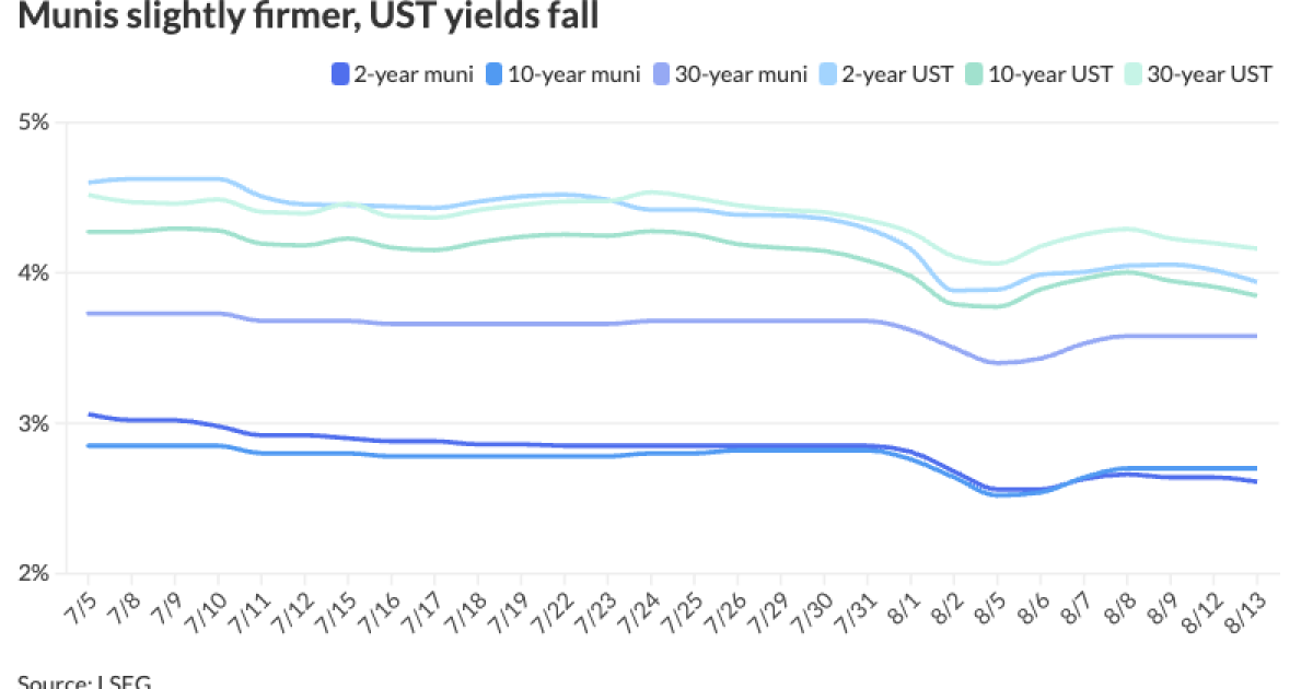 The S&P Global Market Intelligence municipal curve was better: The one-year was at 2.68% (-2) in 2025 and 2.66% (-2) in 2026. The five-year was at 2.56% (-2), the 10-year was at 2.70% (unch) and the 30-year yield was at 3.56% (unch) at 3 p.m.