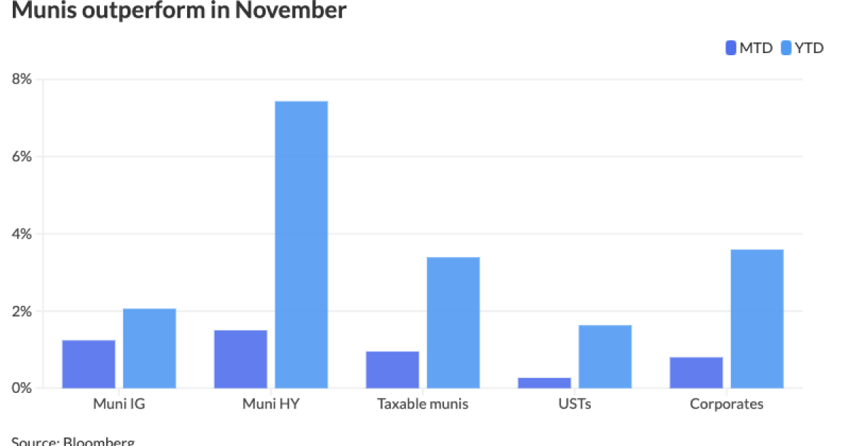 Munis are returning 1.24% in November and 2.06% year-to-date, according to the Bloomberg Municipal Index.