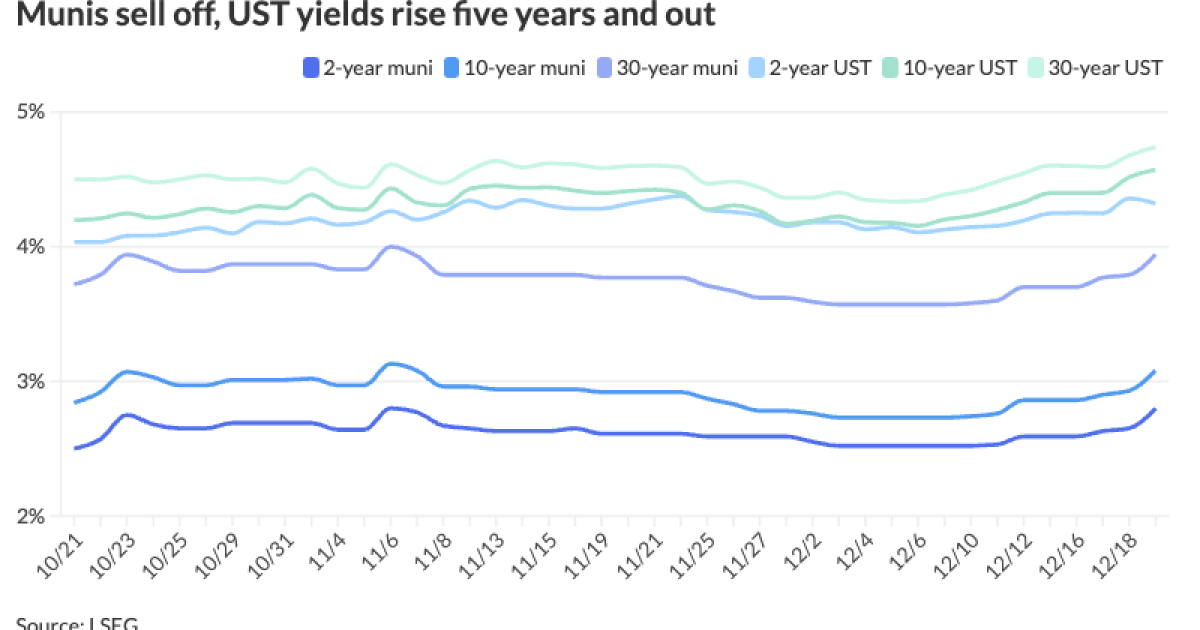 Retail investors have taken note of the volatility as municipal bond mutual funds saw more outflows. LSEG Lipper reported investors pulled $857.1 million for the week ending Dec. 18, following $316.2 million of outflows the previous week.