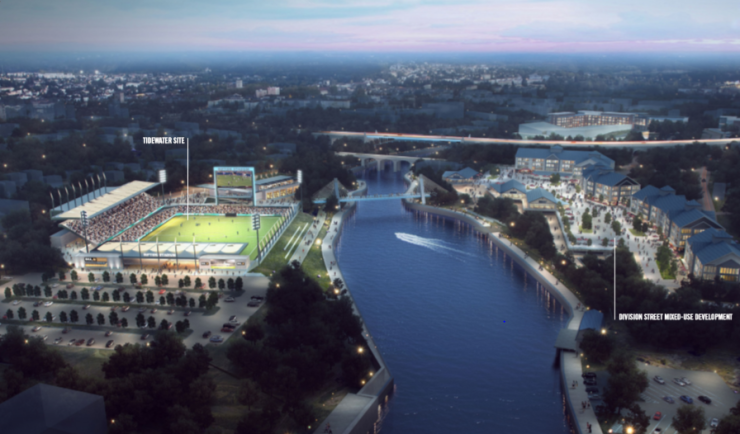 The Tidewater Landing project, situated on both sides of the city’s waterfront, is said to be the largest development project in Pawtucket’s history. In addition to the 10,000-seat stadium, the project calls for hundreds of thousands of square feet of residential and retail development, including an indoor sports complex, housing, a hotel and commercial office space. It also includes a riverwalk park and a pedestrian bridge.