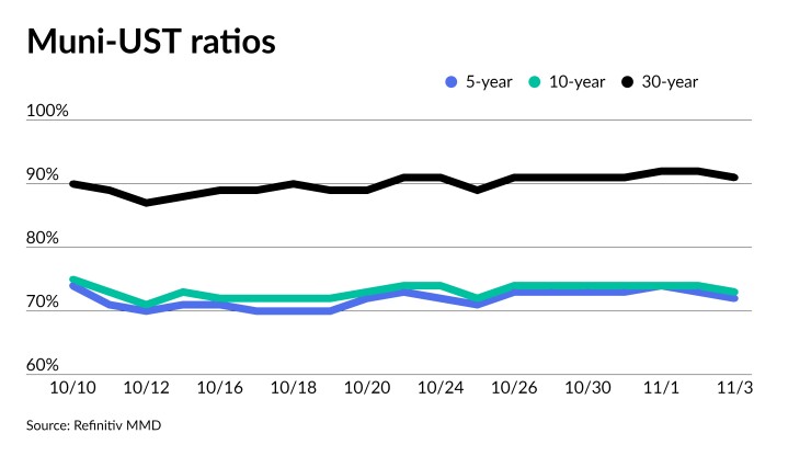 Ratios fell slightly Friday with the two-year muni-to-Treasury ratio at 70%, the three-year was at 71%, the five-year at 72%, the 10-year at 73% and the 30-year at 91%, according to Refinitiv Municipal Market Data’s 3 p.m., ET, read. ICE Data Services had the two-year at 70%, the three-year at 71%, the five-year at 69%, the 10-year at 71% and the 30-year at 89% at 4 p.m.