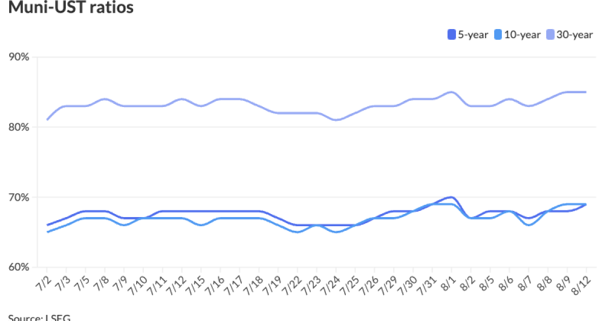 Despite this, munis outperformed USTs as the 10-year muni-UST ratio was at 67.28% versus the prior week’s ratio of 68.2%, Wong said.